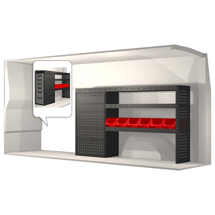 Indretningsforslaget er specielt designet til at passe valgte bilmodel perfekt. For øget funktionalitet og reduceret støj under kørslen er alle hylder udstyret med gummimåtter og skuffer med skum. Monteringssæt medfølger.