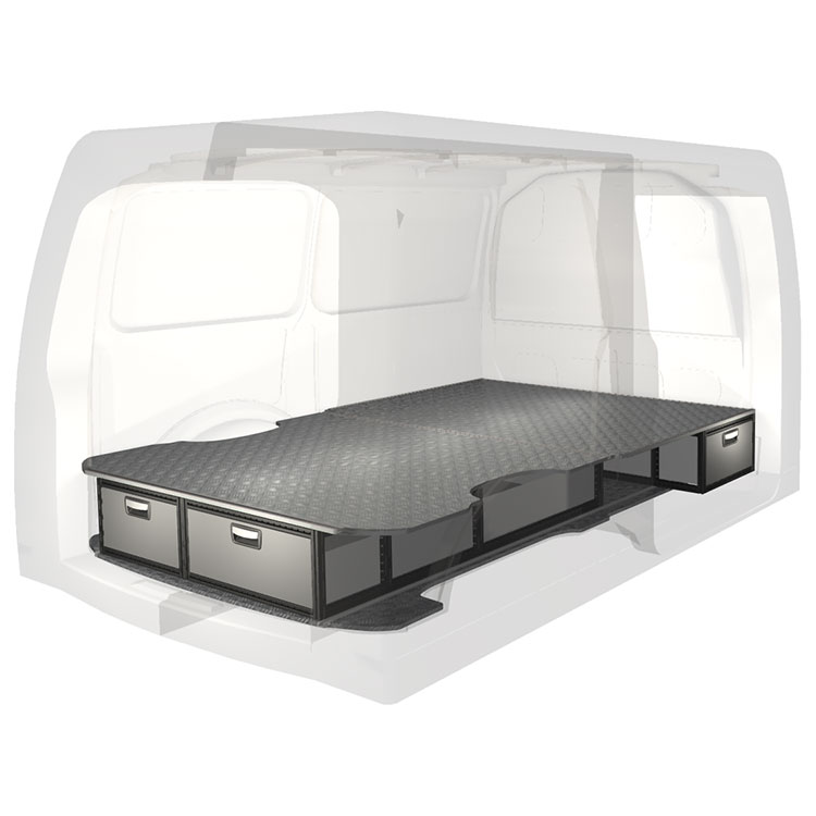 The kit is designed to be fitted on top of a Modul-Floor, utilizing the floor rails for a non-intrusive installation. The double floor is equipped with rails for easy installation of vehicle racking, and edging strips for a nice finish.