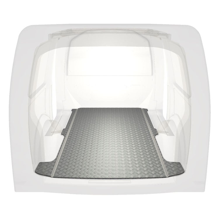 Lette og robuste ekstra lange gulve til en Volkswagen Transporter T6 med skridsikker aluminiumsplade og lastskinner (langsgående) for hurtig og sikker installation af indretningssystemer og andet tilbehør.
