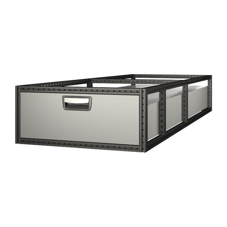 De ekstra lange skuffeenheder har en ramme af ultrastærkt stål og skuffer af aluminium. Skufferne er som standard udstyret med kuglelejer, og blandingen af faste og fleksible lejer gør dem både stabile og nemme at betjene.